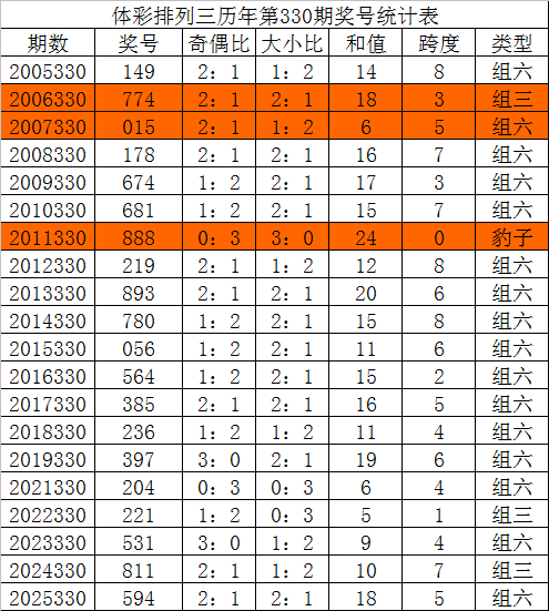 陈列三第2025330期奖号为594,奇偶比为2:1,大小比为2:1,和值为18,跨度为5。