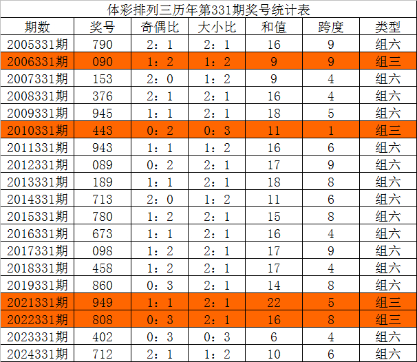 体彩陈列三积年第331期开出奖号别离为:790、090、153、376、945、443、943、089、189、713、780、673、098、458、860、949、808、402、712。统计详见下表: